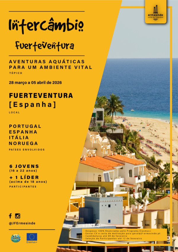 Estão abertas as inscrições para o Intercâmbio Erasmus+, que terá lugar em Fuerteventura, Espanha, entre ... -