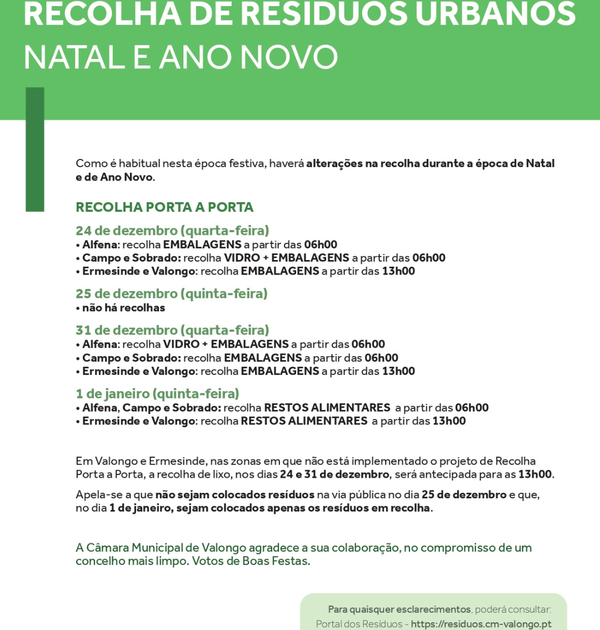 Devido à época festiva a Recolha de Resíduos Urbanos vai sofrer as seguintes alterações: > 31 de dezembro: ...