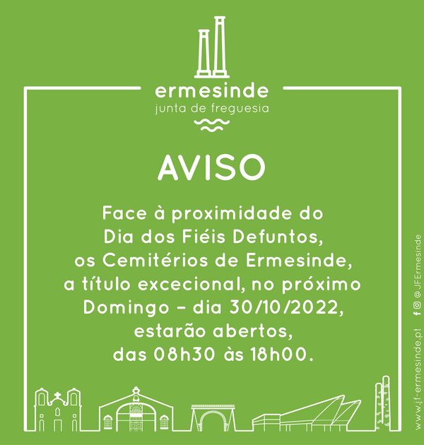 Face à proximidade do Dia dos Fiéis Defuntos, os Cemitérios de Ermesinde, a título excecional, ... -