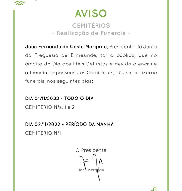 27 Outubro 2022AVISO - Cemitérios | Realização de Funerais
