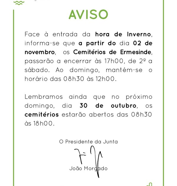 Face à entrada da hora de Inverno, informa-se que a partir do dia 02 de novembro, os Cemitérios ... -