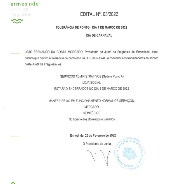 JOÃO FERNANDO DA COSTA MORGADO, Presidente da Junta da Freguesia de Ermesinde, torna público que ... -