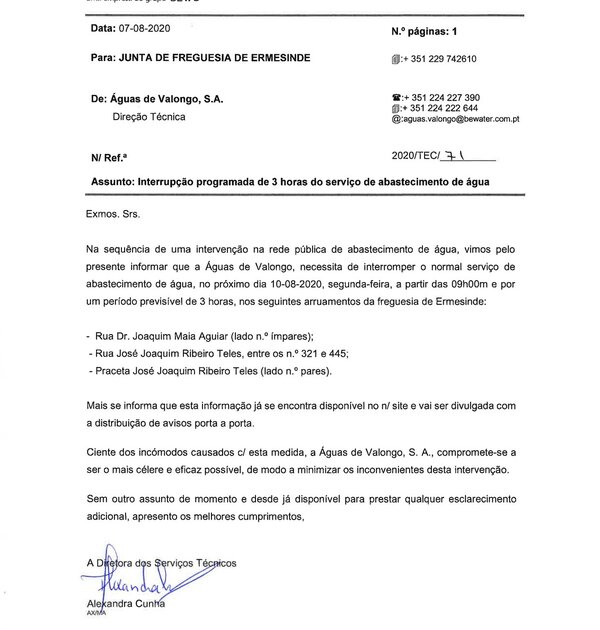 07 Agosto 2020Interrupção programada de 3 horas do serviço de abastecimento de água