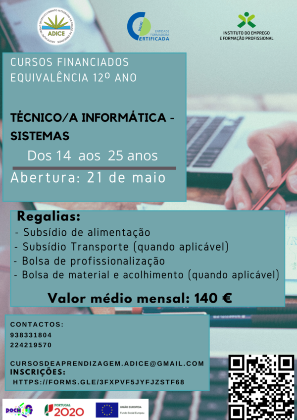 Cursos Financiados Equivalência 12º Ano TÉCNCIO/A INFORMÁTICA - SISTEMASDos 14 aos 25 anosAbertura: 21 de maioCONTACTOS:938 ... -