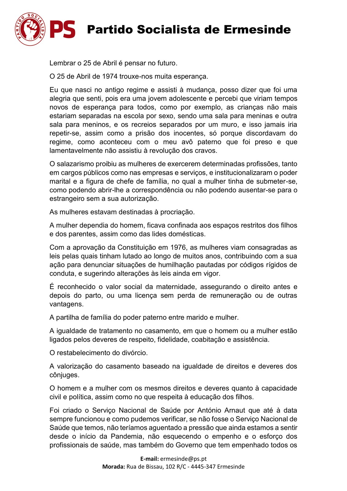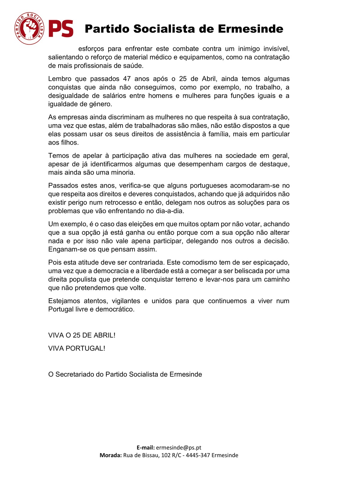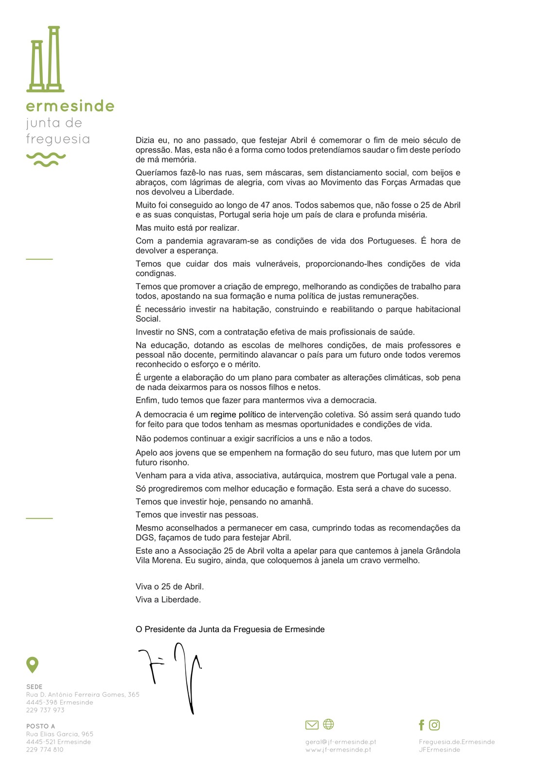 Tamnbém podem ser lidas as Mensagens do Presidente da Assembleia de Freguesia, do Presidente da Junta e dos Partidos representados na Assembleia de Freguesia de Ermesinde.