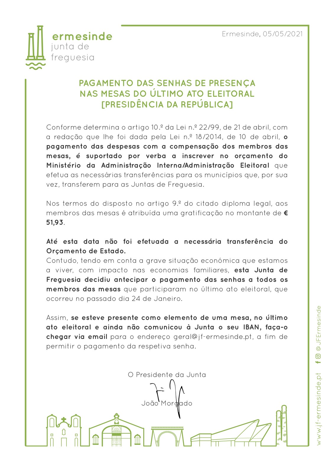 Assim, se esteve presente como elemento de uma mesa, no último ato eleitoral e ainda não comunicou à Junta o seu IBAN, faça-o chegar via email para o endereço geral@jf-ermesinde.pt, a fim de permitir o pagamento da respetiva senha.