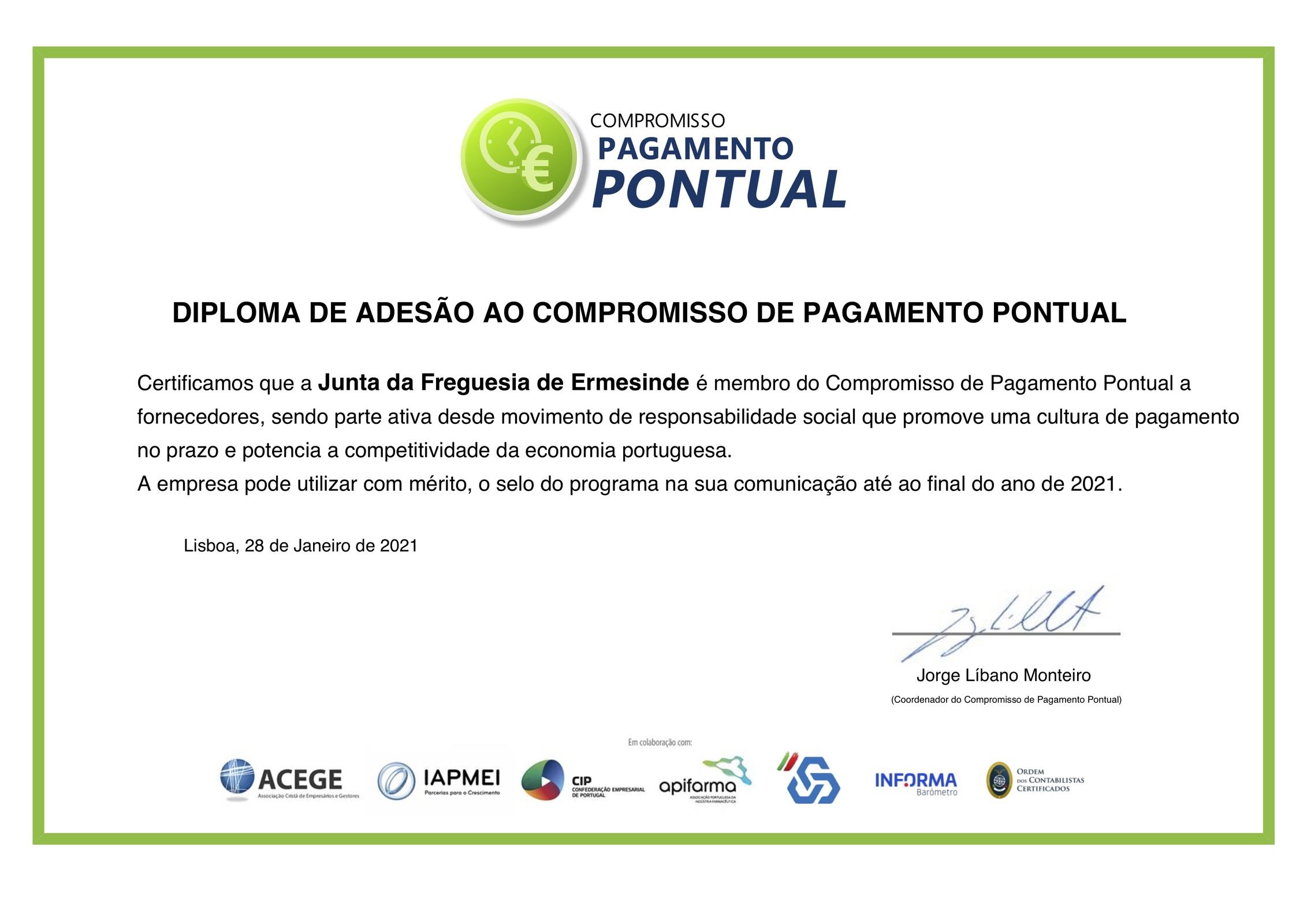 A Junta da Freguesia de Ermesinde foi certificada como membro do Compromisso de Pagamento Pontual a fornecedores, sendo parte ativa desde movimento de responsabilidade social que promove uma cultura de pagamento no prazo e potencia a competitividade da economia portuguesa.