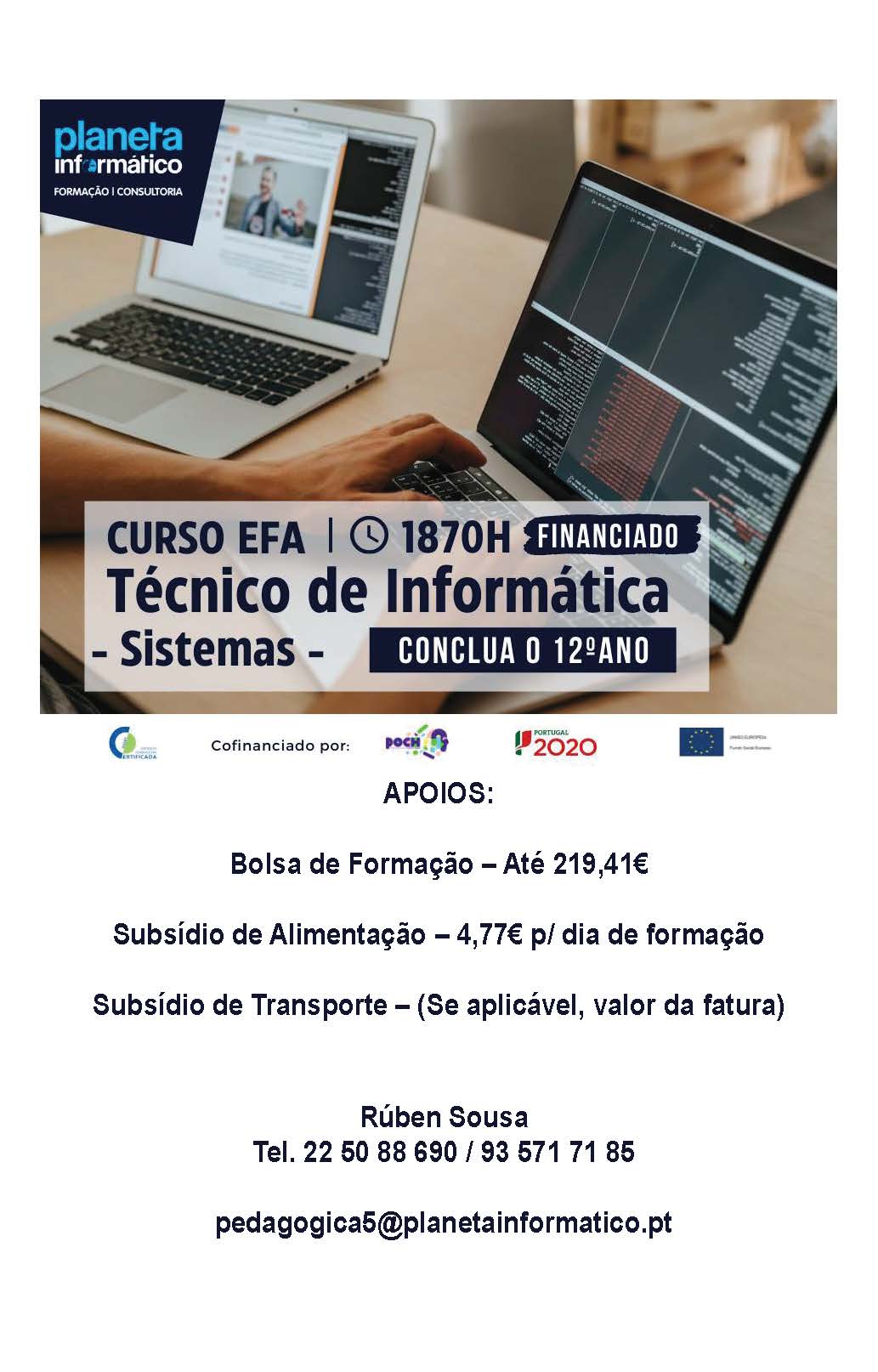 Atualmente, o Planeta Informático, Lda. encontra-se a divulgar o curso EFA de Técnico/a de Informática – Sistemas, que irá decorrer nas suas instalações, na Rua Augusto Lessa, n.º 163 4200-099 Paranhos, em horário laboral, a partir de Fevereiro de 2022.