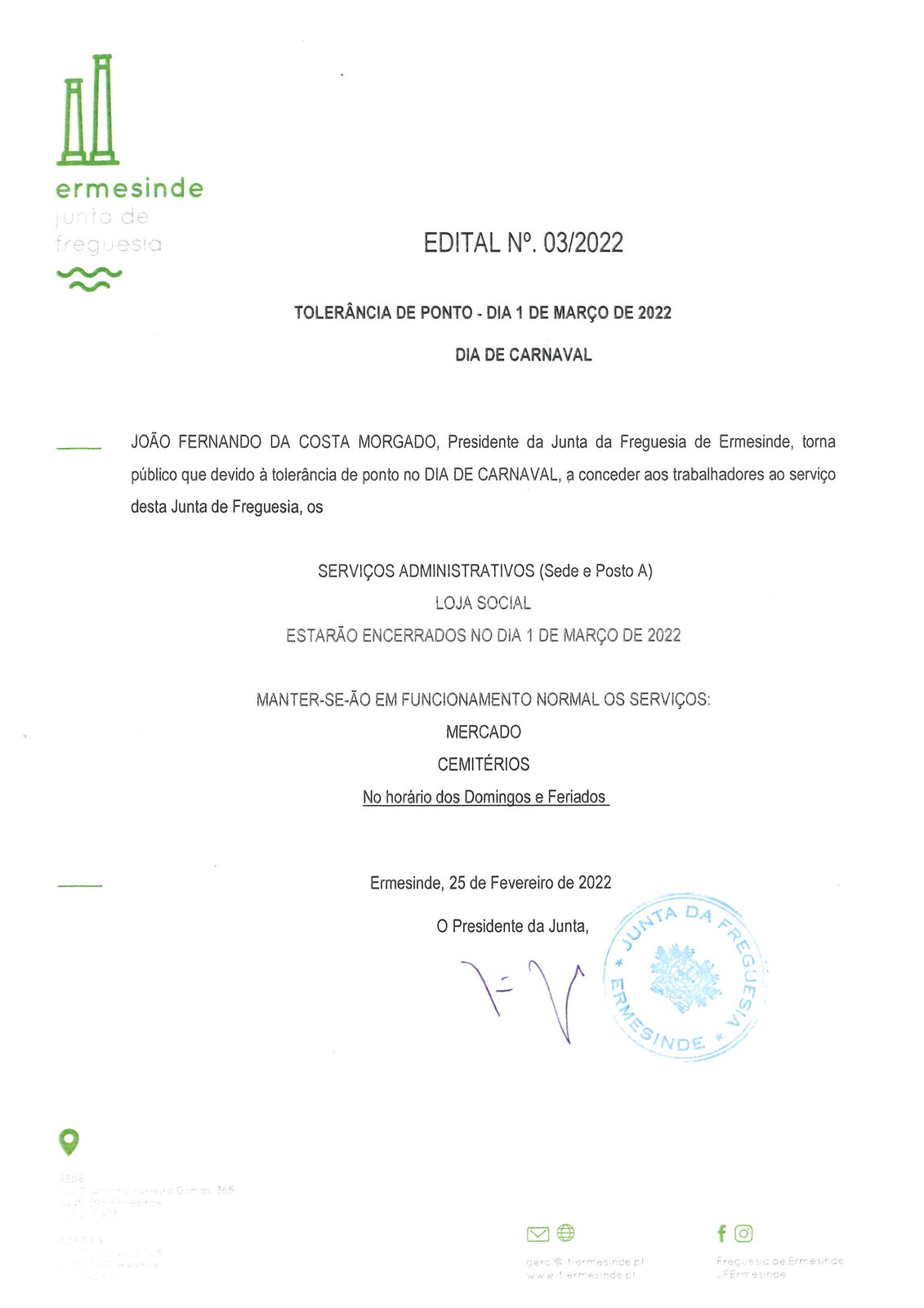 JOÃO FERNANDO DA COSTA MORGADO, Presidente da Junta da Freguesia de Ermesinde, torna público que devido à tolerância de ponto no DIA DE CARNAVAL, a conceder aos trabalhadores ao serviço desta Junta de Freguesia, os