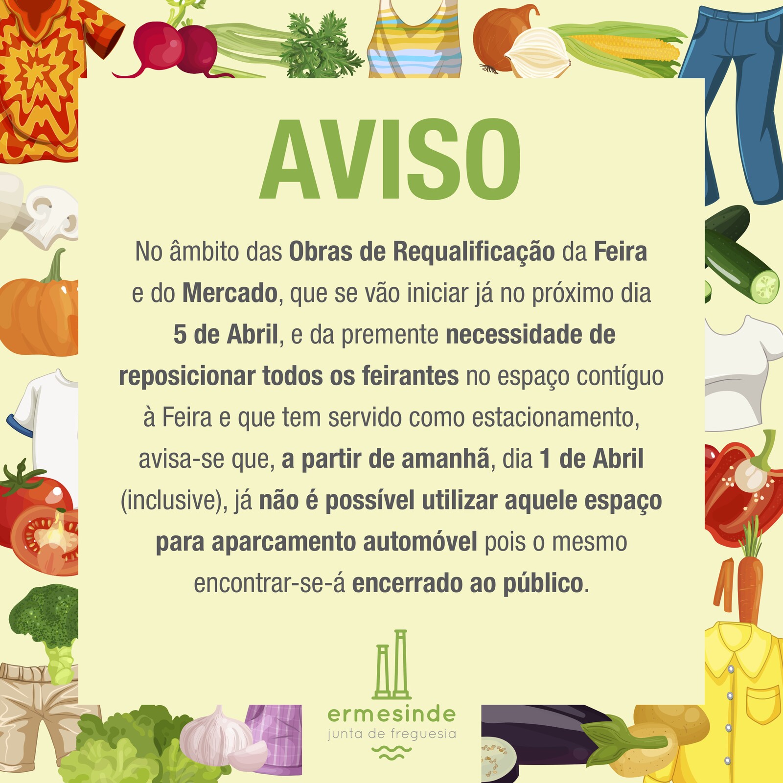No âmbito das obras de requalificação da Feira e do Mercado, que se vão iniciar já no próximo dia 5 de Abril, e da premente necessidade de reposicionar todos os feirantes no espaço contíguo à Feira e que tem servido como estacionamento, avisa-se que, a partir de amanhã, dia 1de Abril (inclusive), já não é possível utilizar aquele espaço para aparcamento automóvel pois o mesmo encontrar-se-á encerrado ao público.