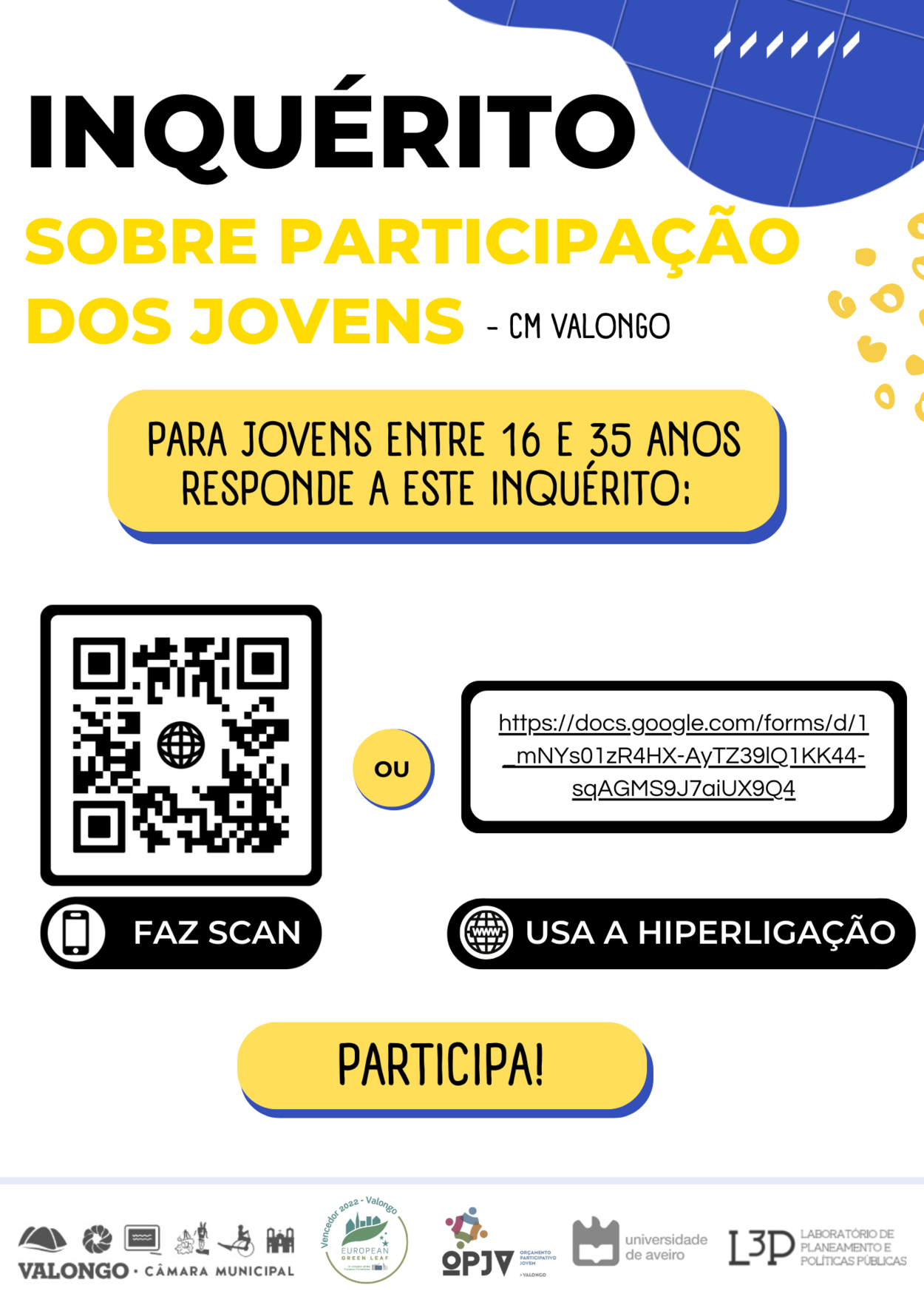 No âmbito do Estudo "10 Anos de Orçamento Participativo Jovem de Valongo", desenvolvido através de uma parceria entre a Câmara Municipal de Valongo e a Universidade de Aveiro, está a ser realizado um inquérito por questionário aos jovens de Valongo sobre as suas práticas de participação.