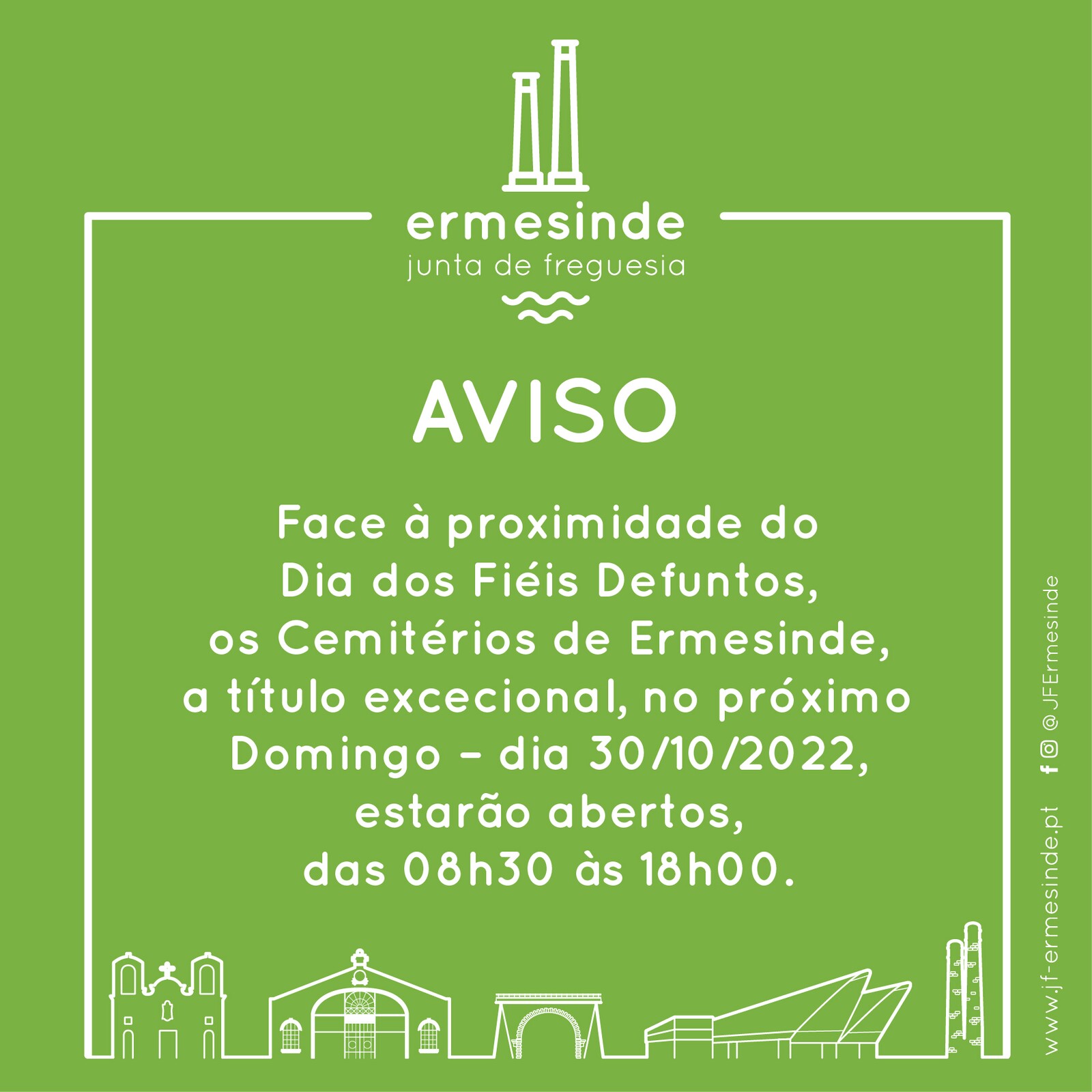 Face à proximidade do Dia dos Fiéis Defuntos, os Cemitérios de Ermesinde, a título excecional, no próximo Domingo – dia 30/10/2022, estarão abertos, das 08h30 às 18h00.