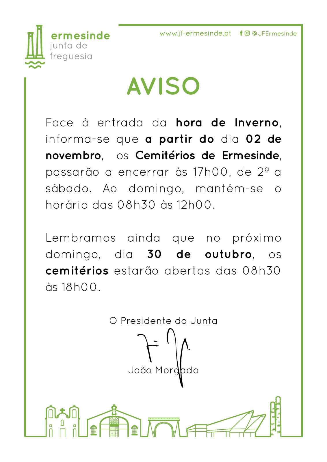 Face à entrada da hora de Inverno, informa-se que a partir do dia 02 de novembro, os Cemitérios de Ermesinde, passarão a encerrar às 17h00, de 2ª a sábado. Ao domingo, mantém-se o horário das 08h30 às 12h00.