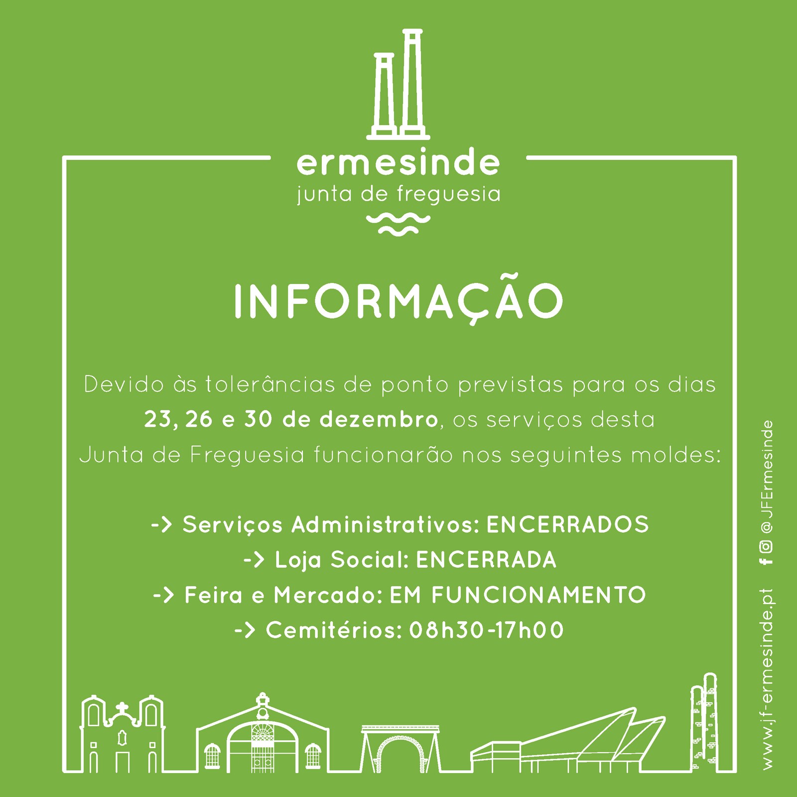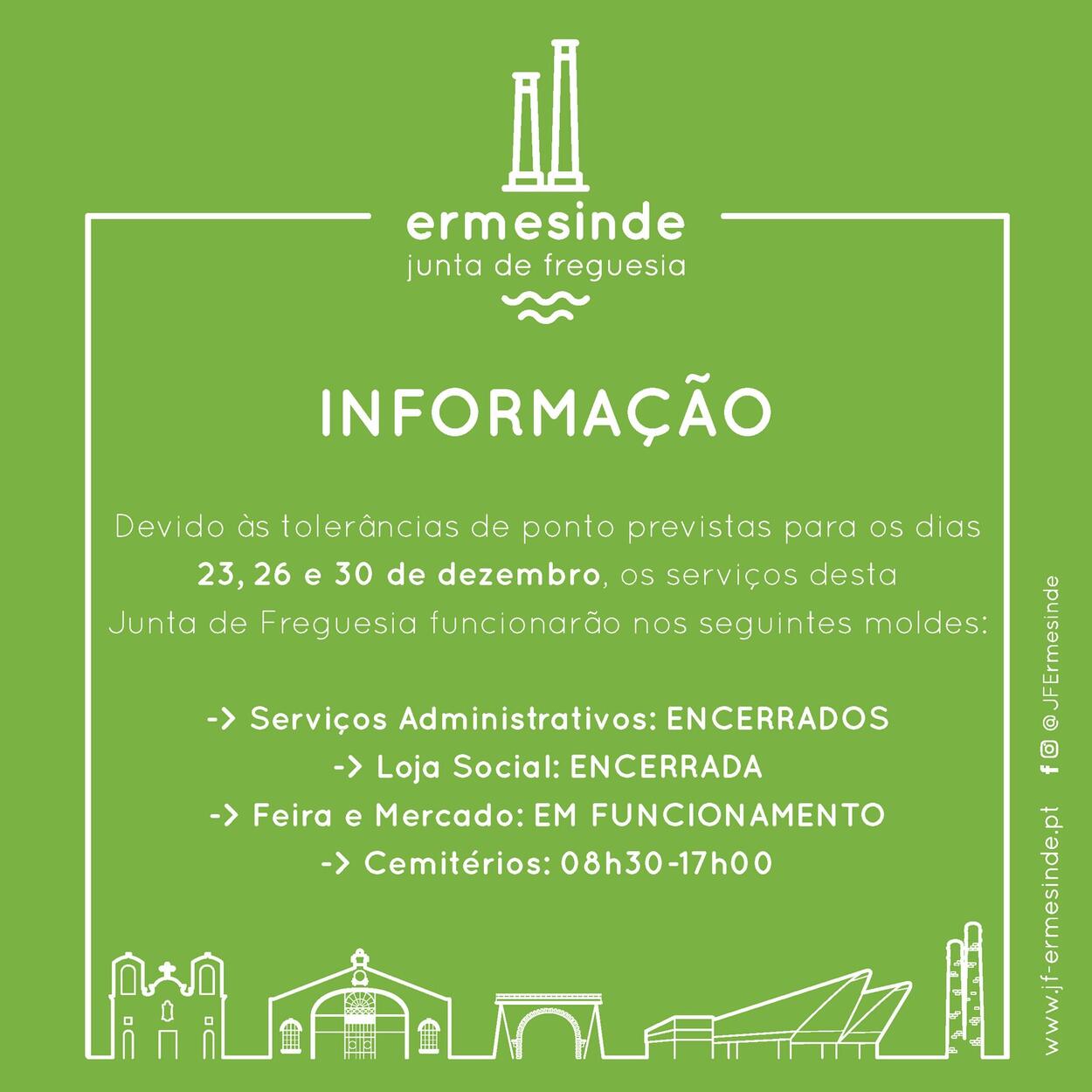 Nos dias 23, 26 e 30 de dezembro, os serviços desta Junta da Freguesia funcionarão nos seguintes moldes: