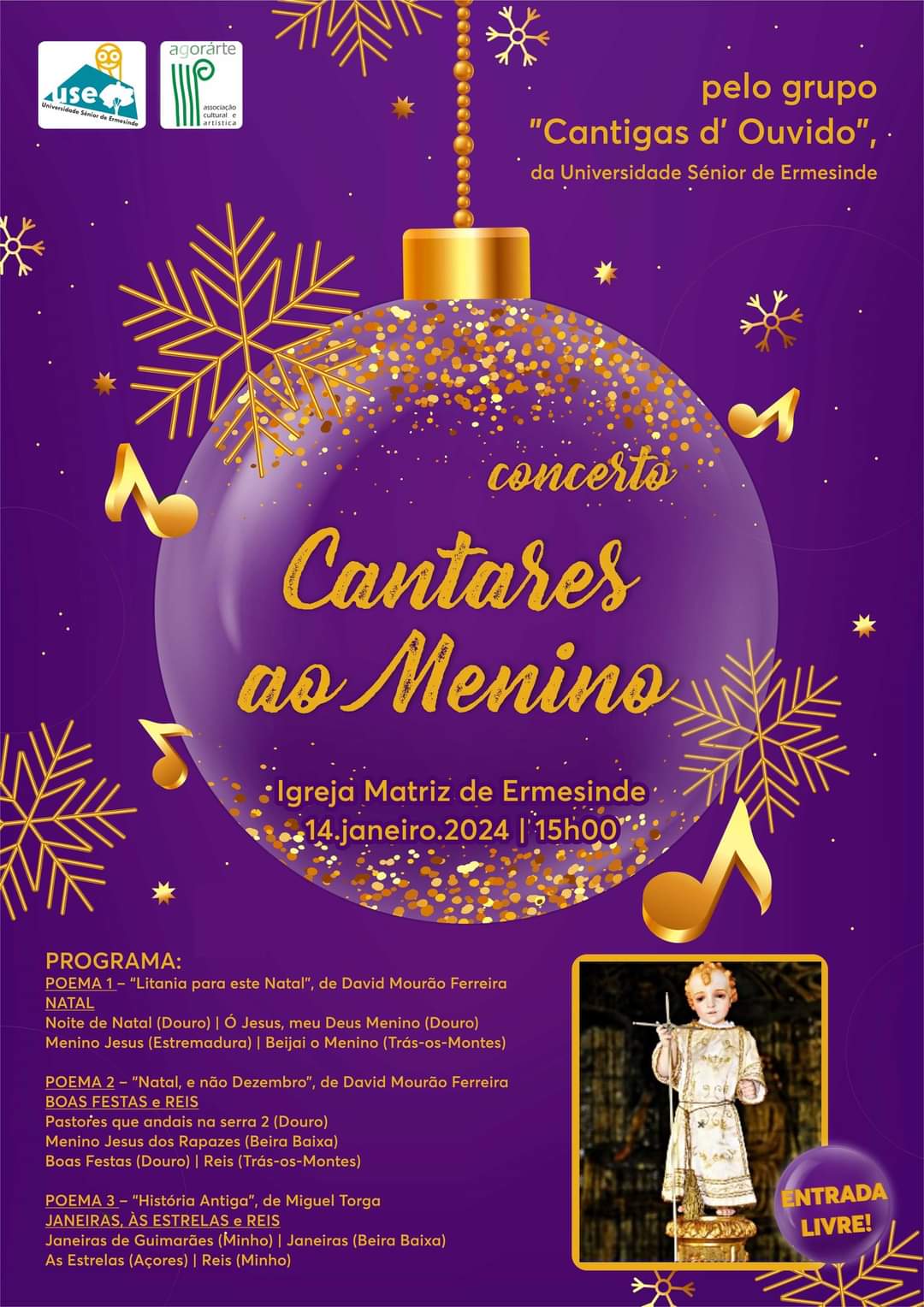 A Universidade Sénior de Ermesinde através da sua valência Agorarte promove um concerto de Cantares ao Menino dia 14 de Janeiro de 2023 na Igreja Matriz de Ermesinde.