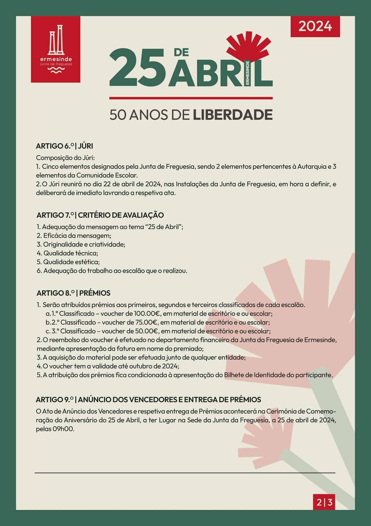 🔹 Subordinado ao tema “25 de Abril”, este concurso pretende apelar à participação de toda a população de Ermesinde, com o intuito de promover a criatividade, vincando valores como a Democracia, Cidadania, Liberdade e Responsabilidade.