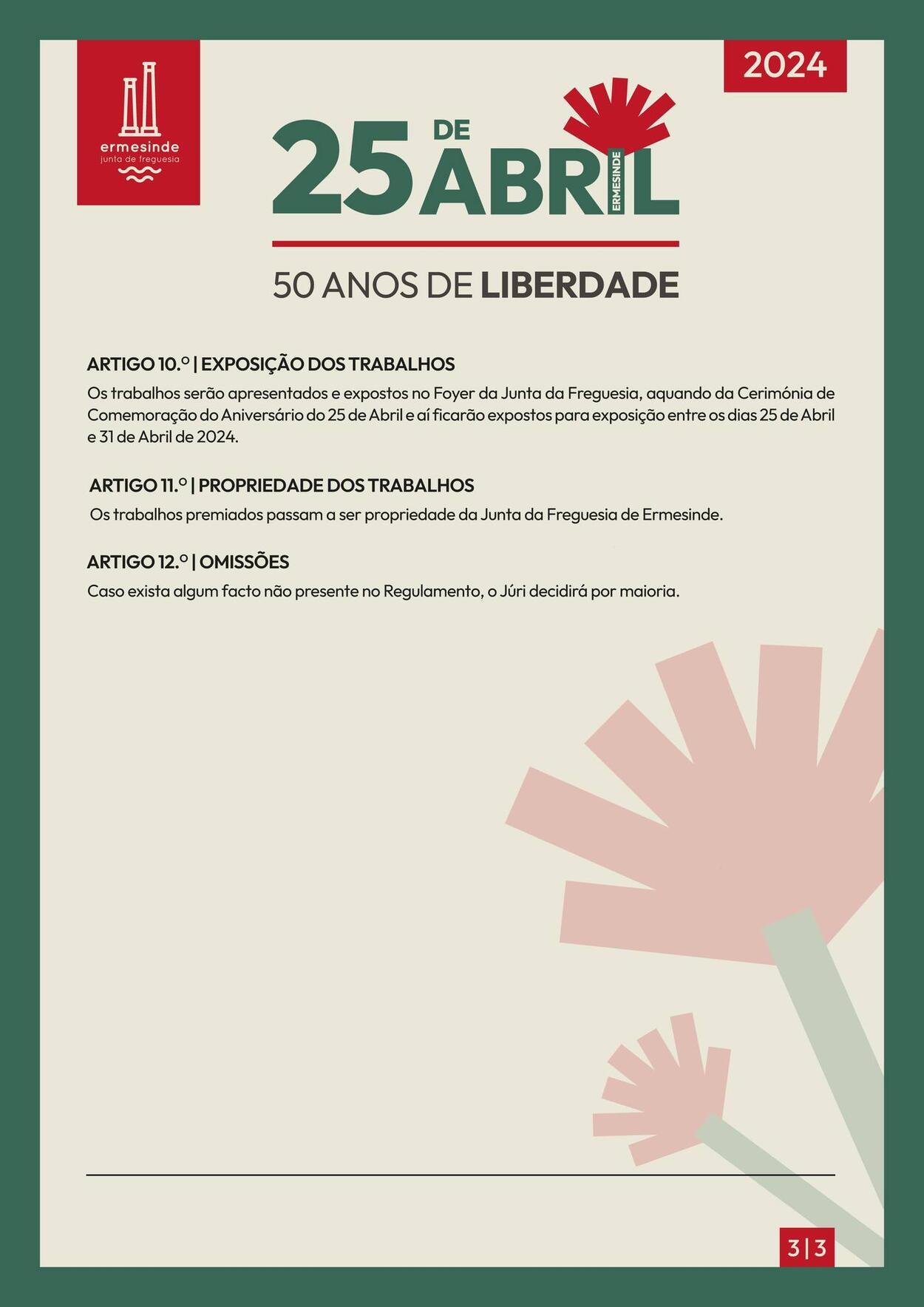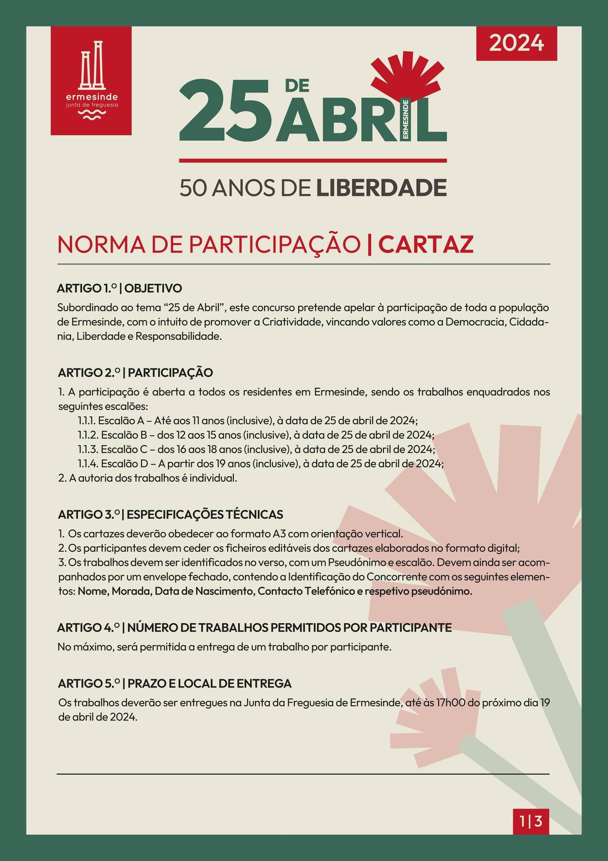 🔹 No âmbito das comemorações dos 50 anos do 25 de Abril, a Junta de Freguesia de Ermesinde convida toda a comunidade a participar no concurso de cartazes sobre o 25 de Abril - 50 anos de Liberdade.