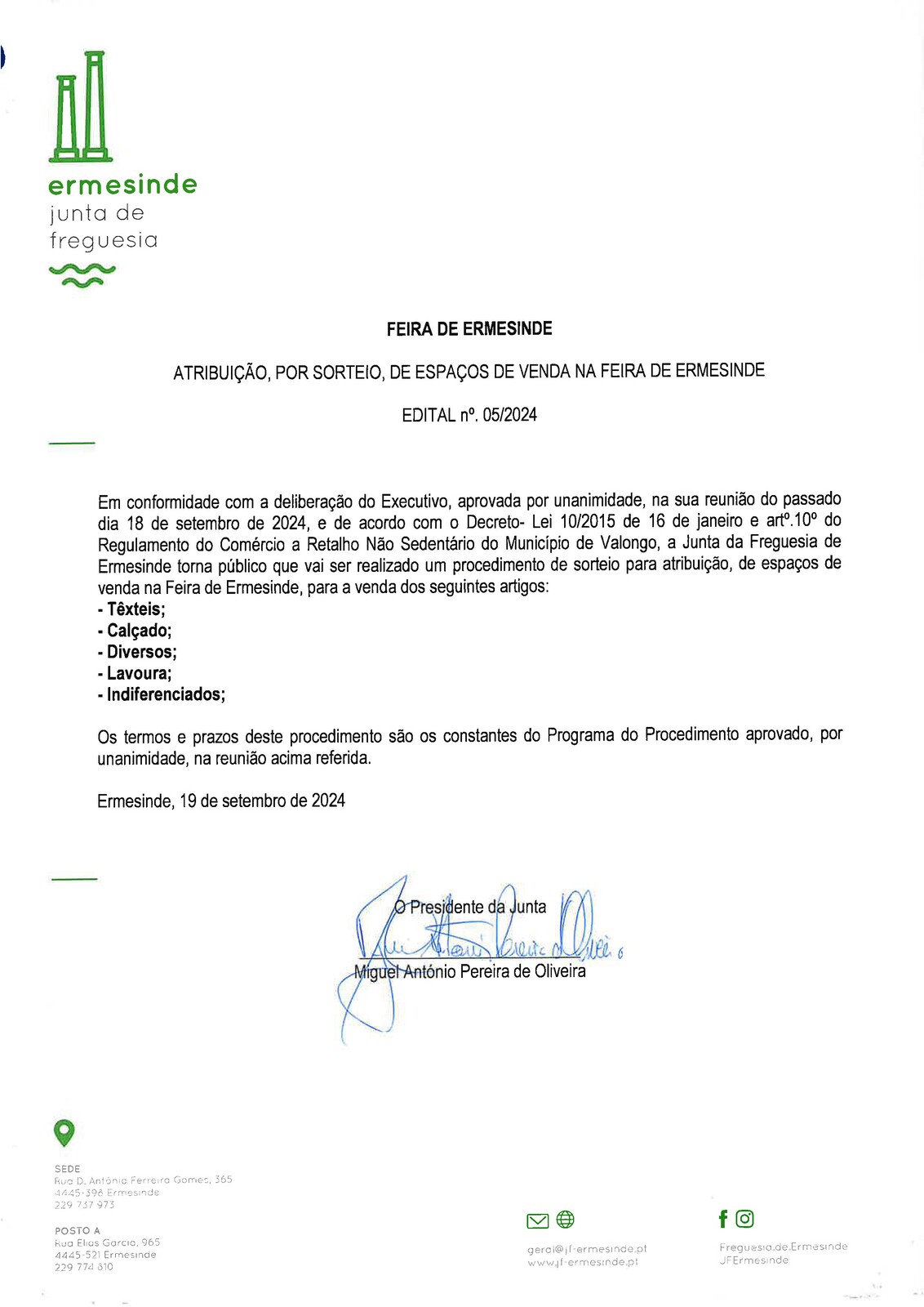 Atribuição, por sorteio, de espaços de venda na Feira de Ermesinde