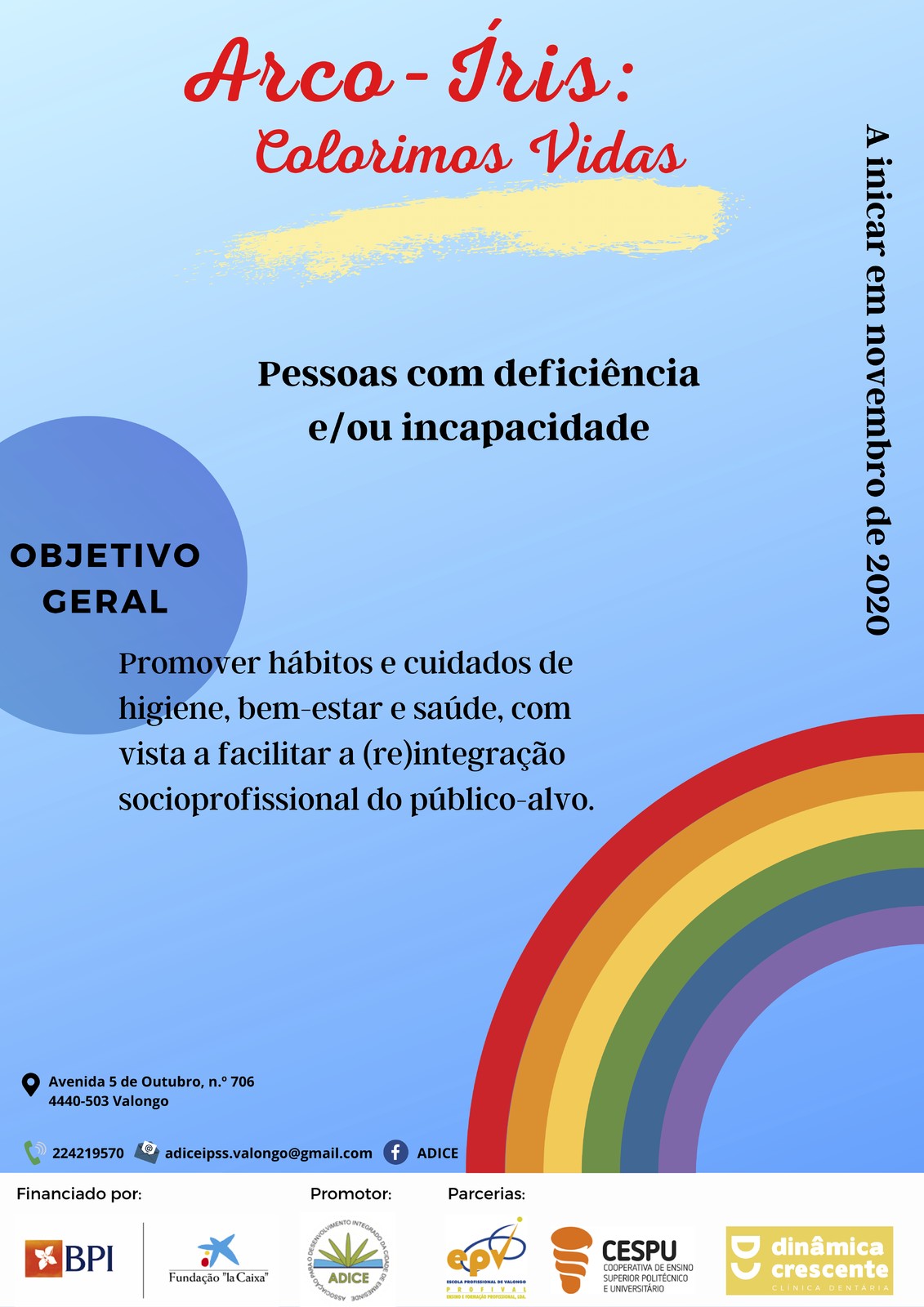 O Projeto Arco-Íris: Colorimos Vidas visa promover a (re)integração de pessoas com deficiência e/ou incapacidade no mercado de trabalho, diminuindo, consequentemente, a sua situação de exclusão/vulnerabilidade social.