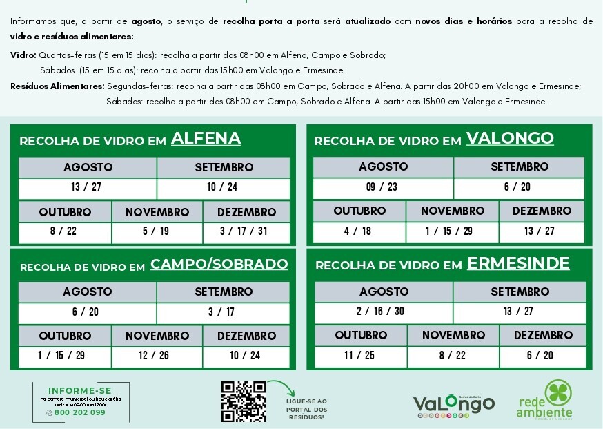 A partir do dia 01 agosto 2025, a recolha seletiva porta a porta de resíduos alimentares, passará a ser realizada à segunda-feira e ao sábado, nos mesmos horários (a partir das 20h00 à segunda-feira e a partir das 15h00 ao sábado), deixando de existir recolha deste fluxo à quarta-feira.