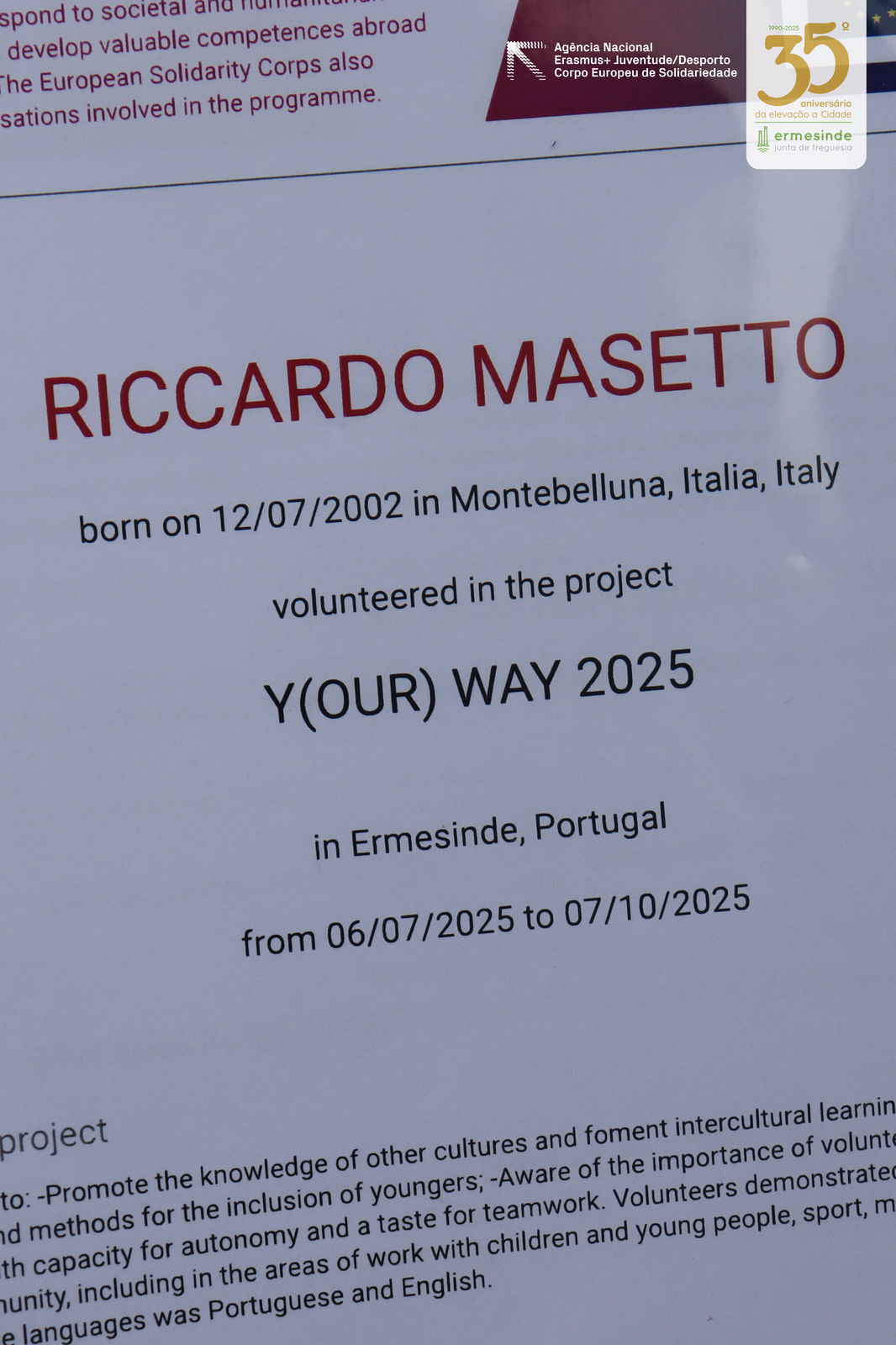 No âmbito do Programa Copo Europeu de Solidariedade, o voluntário Riccardo (Itália), terminou o seu projeto de voluntariado na Junta da Freguesia de Ermesinde, local onde dinamizou várias atividades desde julho a outubro 2025.