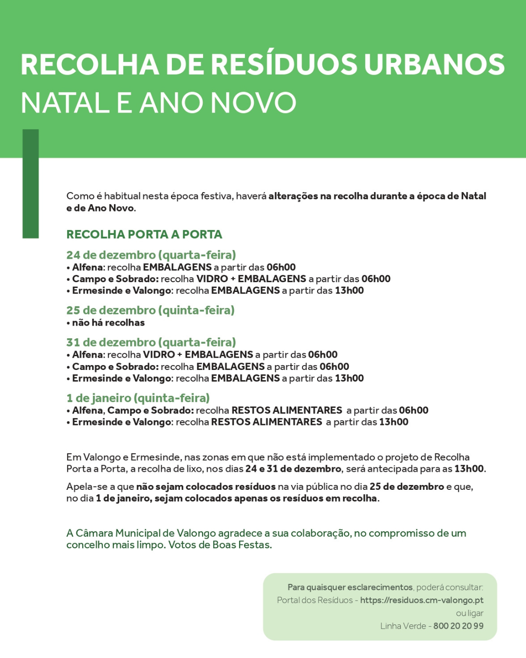 Devido à época festiva a Recolha de Resíduos Urbanos vai sofrer as seguintes alterações: