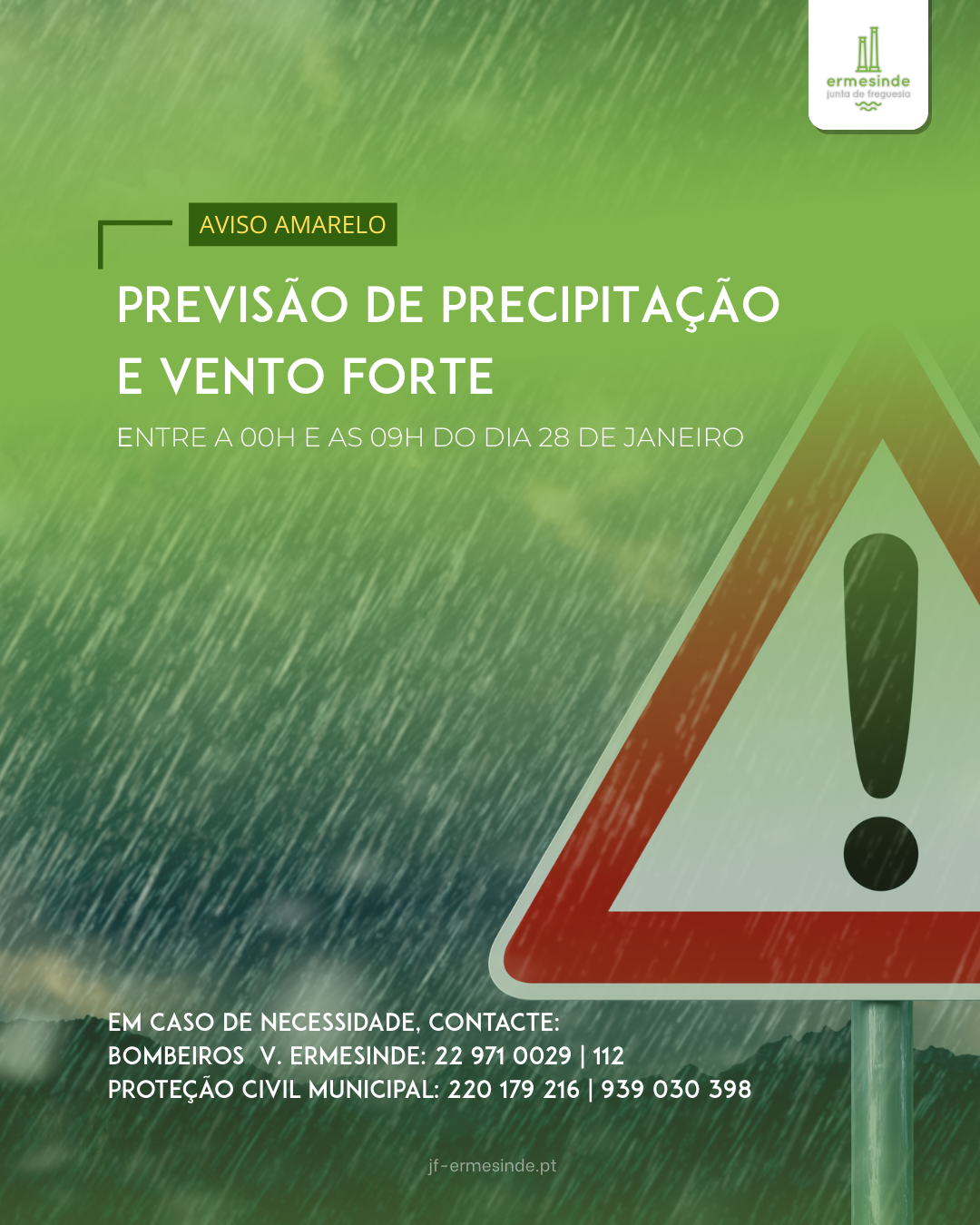 Entre as 𝟬𝟬𝗵𝟬𝟬 𝗲 𝗮𝘀 𝟬𝟵𝗵𝟬𝟬 do dia 28 de janeiro, prevê-se a manutenção de precipitação e vento forte na Freguesia de Ermesinde.