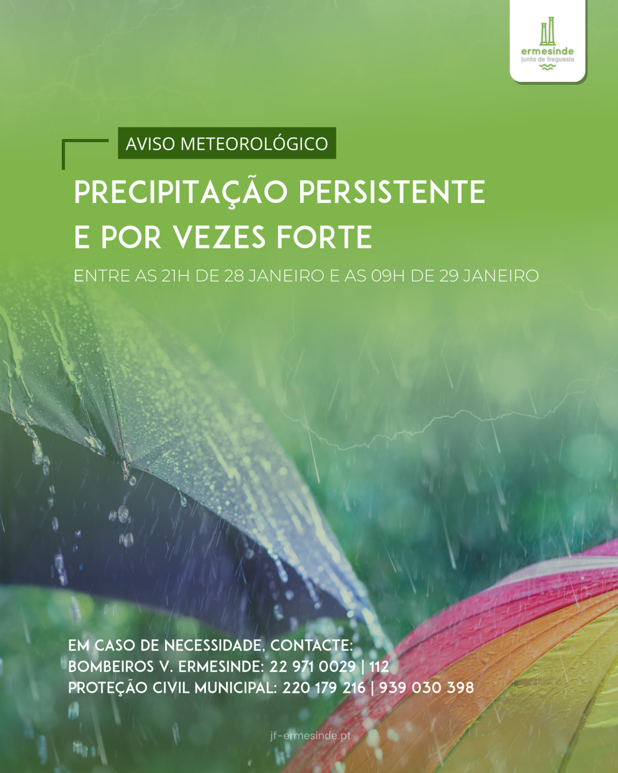 Entre as 𝟮𝟭𝗵𝟬𝟬 de 28 janeiro 𝗲 𝗮𝘀 𝟬𝟵𝗵𝟬𝟬 do dia 29 de janeiro, prevê-se a manutenção de precipitação persistente na Freguesia de Ermesinde.