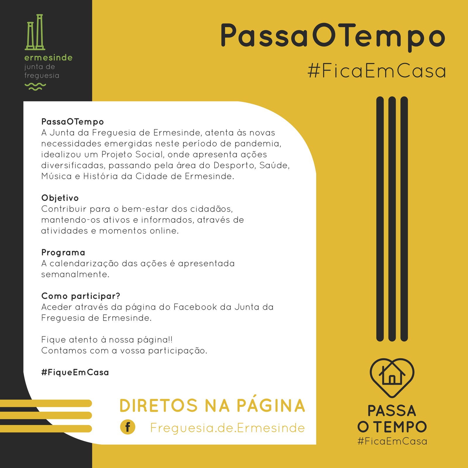 A Junta da Freguesia de Ermesinde, atenta às novas necessidades emergidas neste período de pandemia, idealizou um Projeto Social, onde apresenta ações diversificadas, passando pela área do Desporto, Saúde, Música e História da Cidade de Ermesinde.