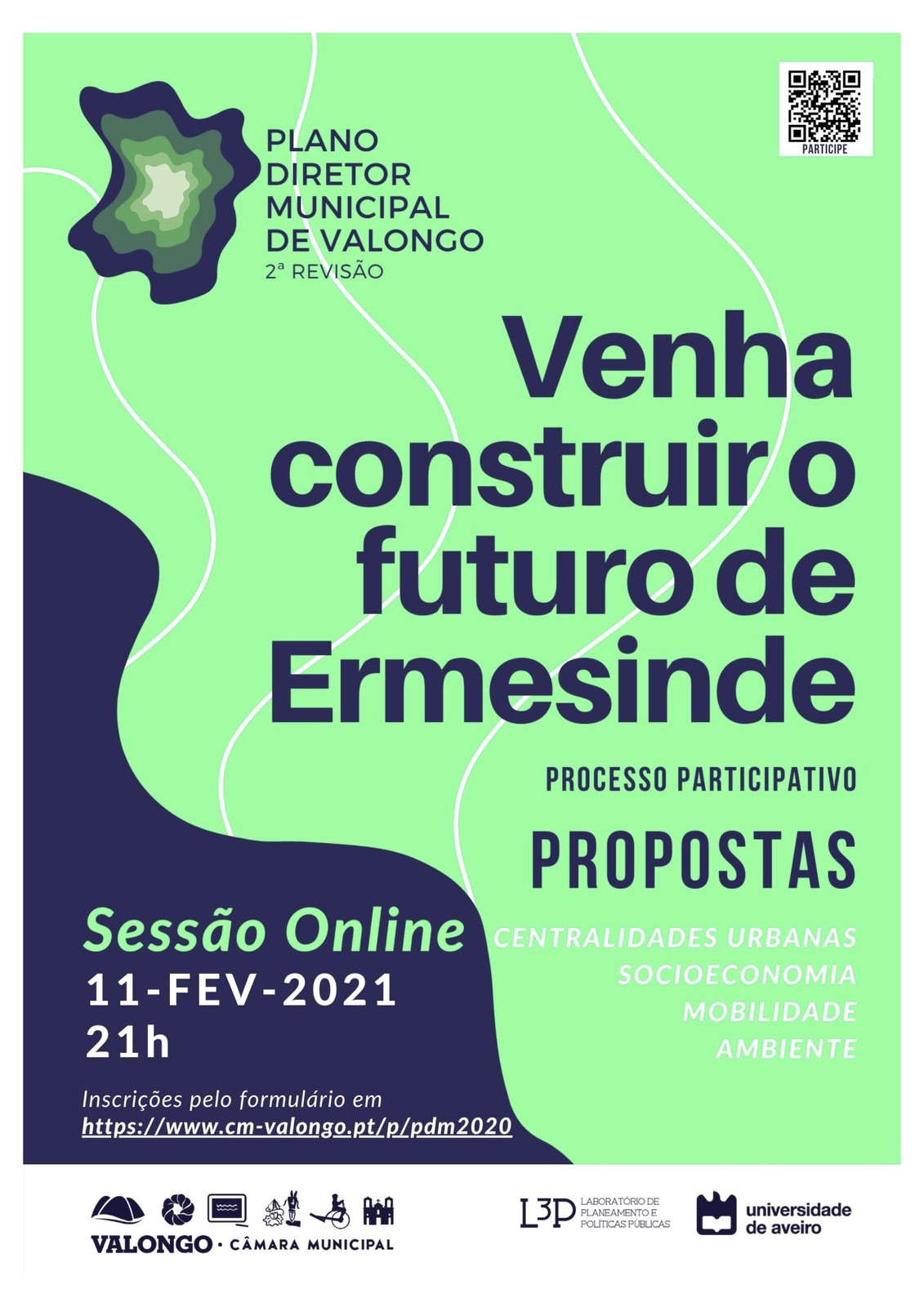 Para fazer parte deste processo, é necessário inscrever-se nas Sessões Participativas de Propostas, que se realizarão através da plataforma ZOOM. Inscreva-se em e escolha , https://www.cm-valongo.pt/p/pdm2020 em que Freguesia deseja participar e indique, por ordem de preferência, a sala temática que mais lhe interessa (ambiente, mobilidade, sócio economia e centralidades urbanas).