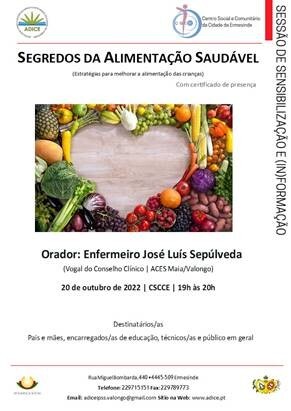 A ADICE, no âmbito da atividade do Centro Social e Comunitário da Cidade de Ermesinde, vai levar a cabo no próximo dia 20 de outubro 2022 uma Ação de (in)formação para pais e mães, encarregados/as de educação, técnicos/as de intervenção social, educadores/as, professores/as e público em geral, sobre a temática da relação "Segredos da alimentação Saudável – estratégias para melhorar a alimentação das crianças". Esta sessão será dinamizada pelo Enfermeiro José Luís Sepúlveda (Vogal do Conselho Clínico | ACES Maia/Valongo).
