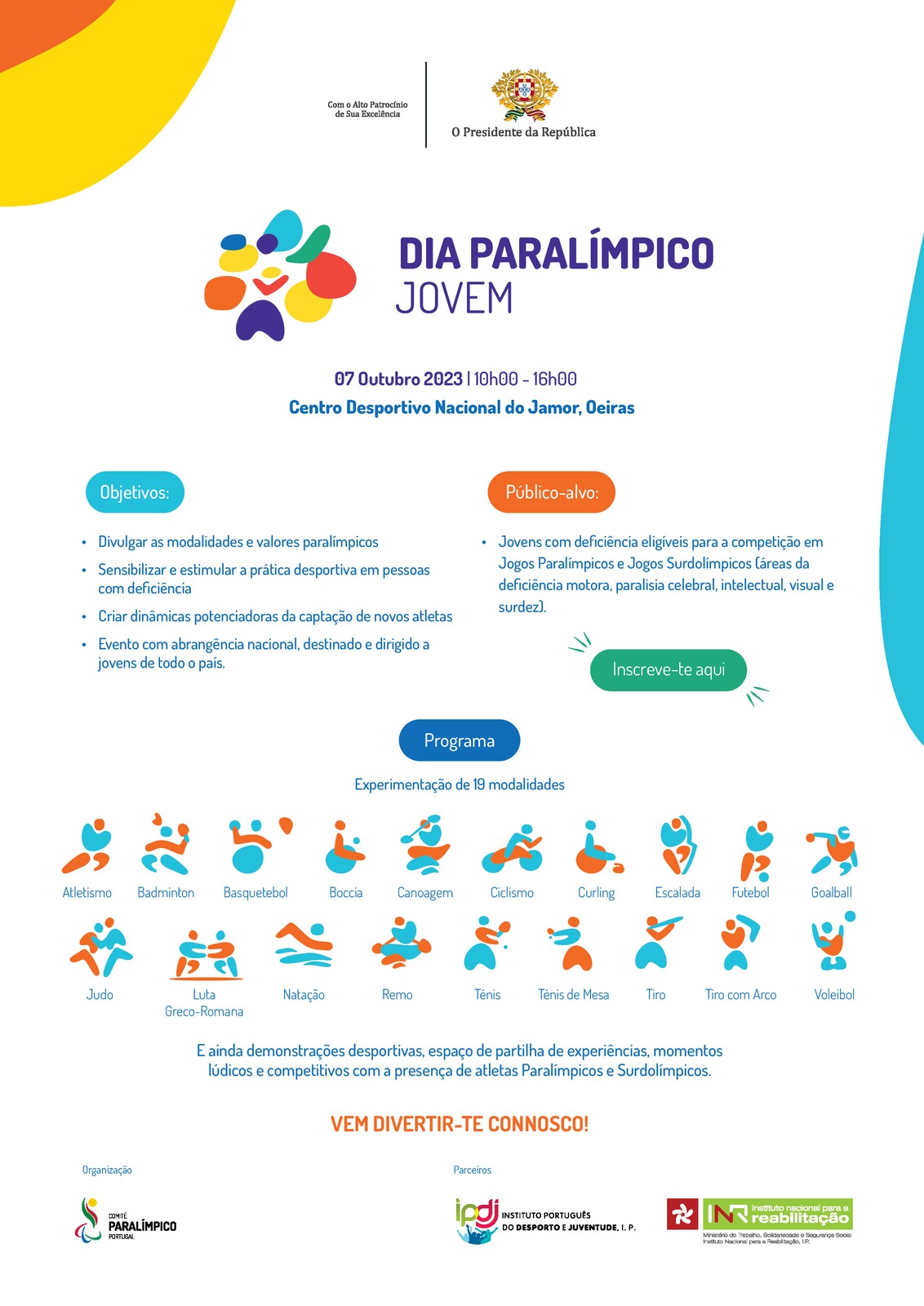 O Comité Paralímpico de Portugal (CPP) irá promover no sábado, dia 7 de outubro de 2023 a primeira edição do Dia Paralímpico Jovem no Complexo Desportivo do Jamor, em Oeiras, com o principal objetivo de contar com a participação dos jovens com deficiência de todo o país, elegíveis para o desporto Paralímpico e Surdolímpico. Um objetivo ambicioso cujo sucesso do projeto que aqui é apresentado em muito dependerá do envolvimento e colaboração da Junta de Freguesia a que V. Exa. preside.