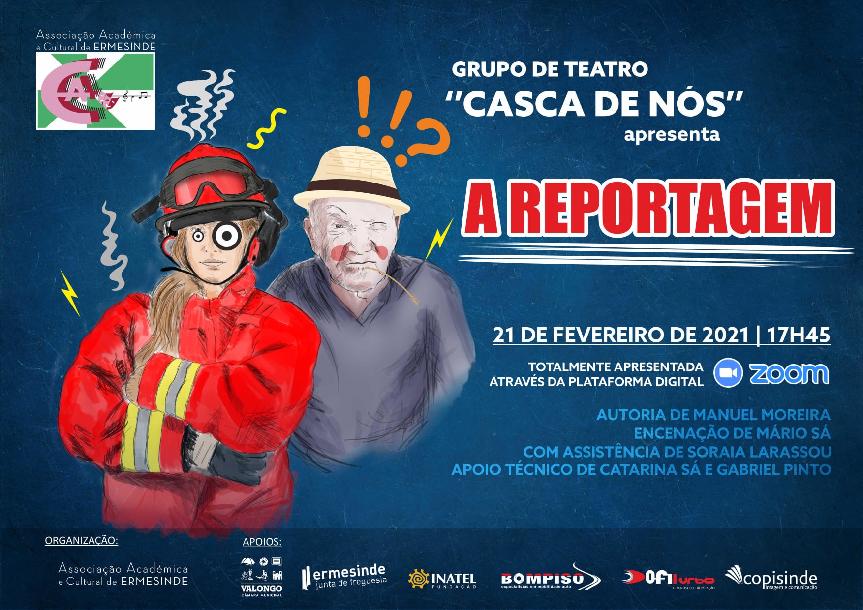 O Grupo de Teatro "Casca de Nós" da Associação Académica e Cultural de Ermesinde apresenta a peça de Teatro "A Reportagem", no dia 21 de Fevereiro de 2021 às 17h45, via Zoom. O espetáculo é inteiramente gratuito e após a pré-reserva, é enviado, no dia anterior à apresentação, o link que dará acesso ao espetáculo, que tem uma lotação limite de 80 participantes.