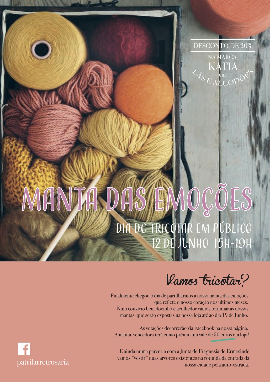 Neste dia vamos tricotar juntos! Vamos terminar o evento "A manta das minhas emoções", num convívio bem docinho e acolhedor, e vamos tricotar para decorar a rotunda da entrada de Ermesinde.