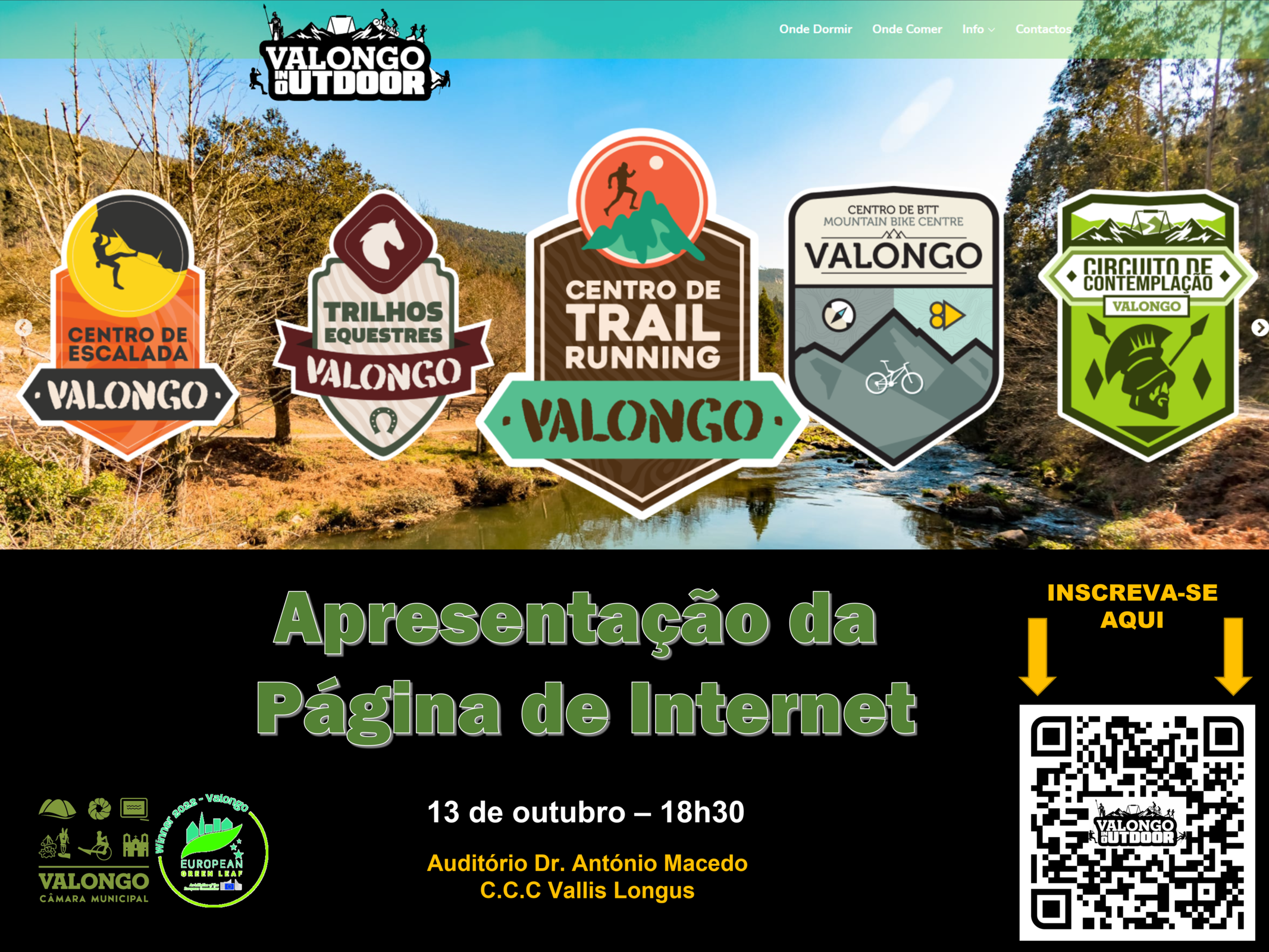 A apresentação do site Valongo In Outdoor, realiza-se no dia 13 outubro, pelas 18h30, no Auditório Dr. António Macedo, no âmbito da Semana Europeia da Democracia Local.