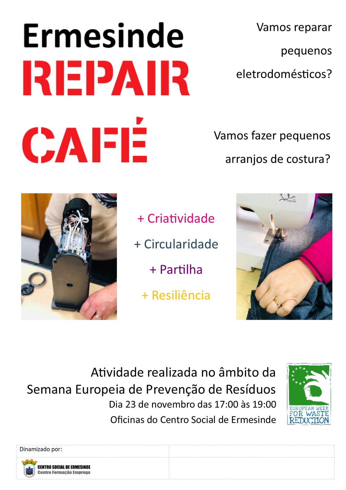 Dia 23 de novembro de 2021, das 17:00 às 19:00, no Centro Social de Ermesinde. Vamos ajudá-lo/a a reparar pequenos eletrodomésticos e/ ou a fazer pequenos arranjos de costura.