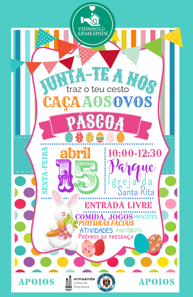 A Associação Vizinhos de Ermesinde irá realizar a "Caça aos Ovos" no terreno junto à Igreja da Santa Rita, propriedade do Colégio de Ermesinde, no próximo dia 15 de abril, das 10h00 às 12h30.